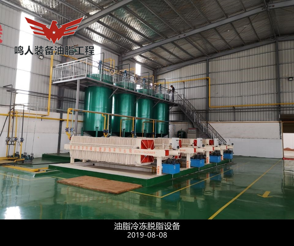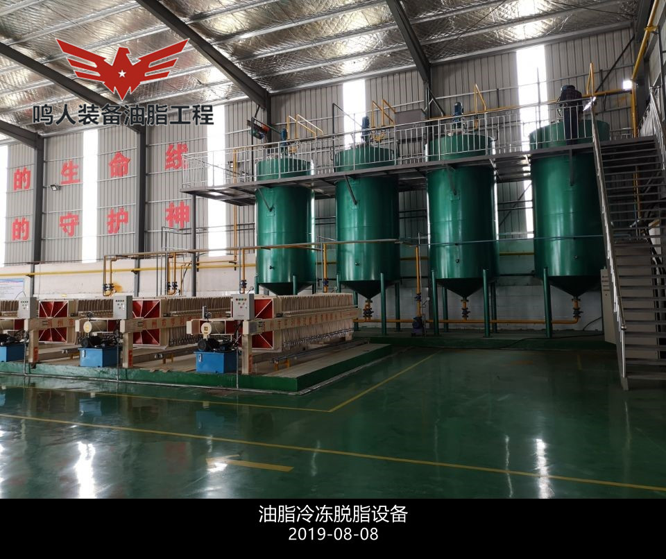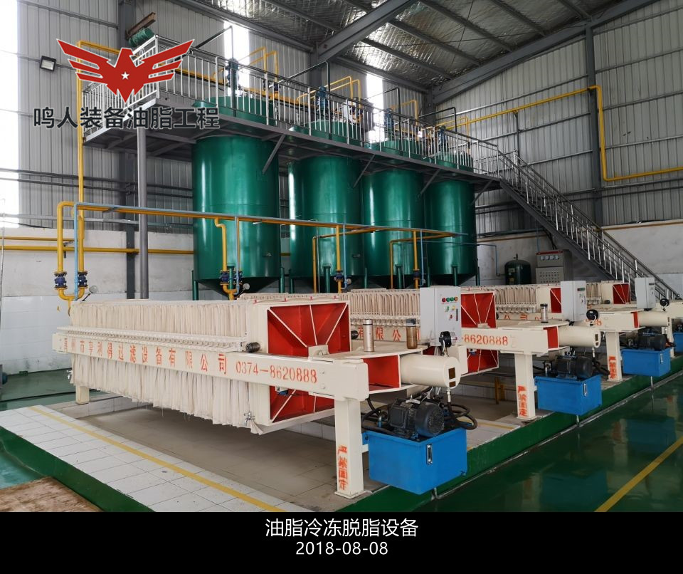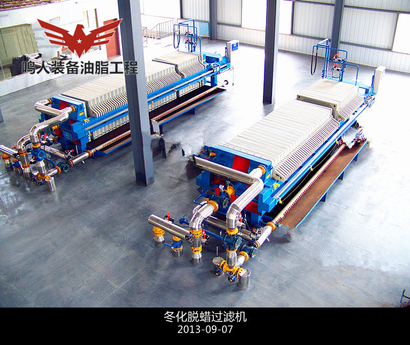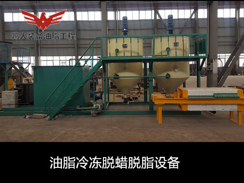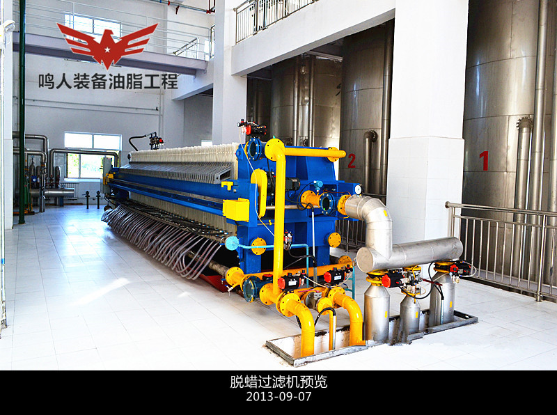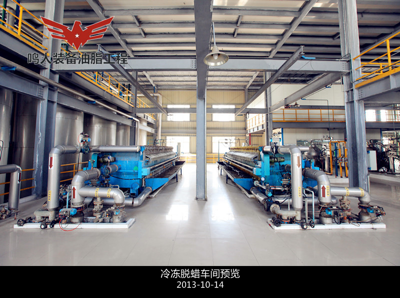 低溫脫蠟即單靠冷凍結晶,然后用機械方法分離油、蠟而不加任何輔助劑和輔助手段的脫蠟方法。分離時采用加壓過濾、真空過濾和離心分離等設備。此法**簡單的是一次結晶、過濾法。將脫臭后的油脂(溫度在 50℃以上)移入有冷卻裝置的結晶養(yǎng)晶罐,慢速攪拌,在常壓下充分冷卻,整個冷卻結晶時間為48h,然后過濾分離油、蠟質。過濾壓強維持在 0.3–0.35MPa,過濾后要及時用壓縮空氣吹出蠟中夾帶的油脂,濾出的油即為脫蠟成品油。